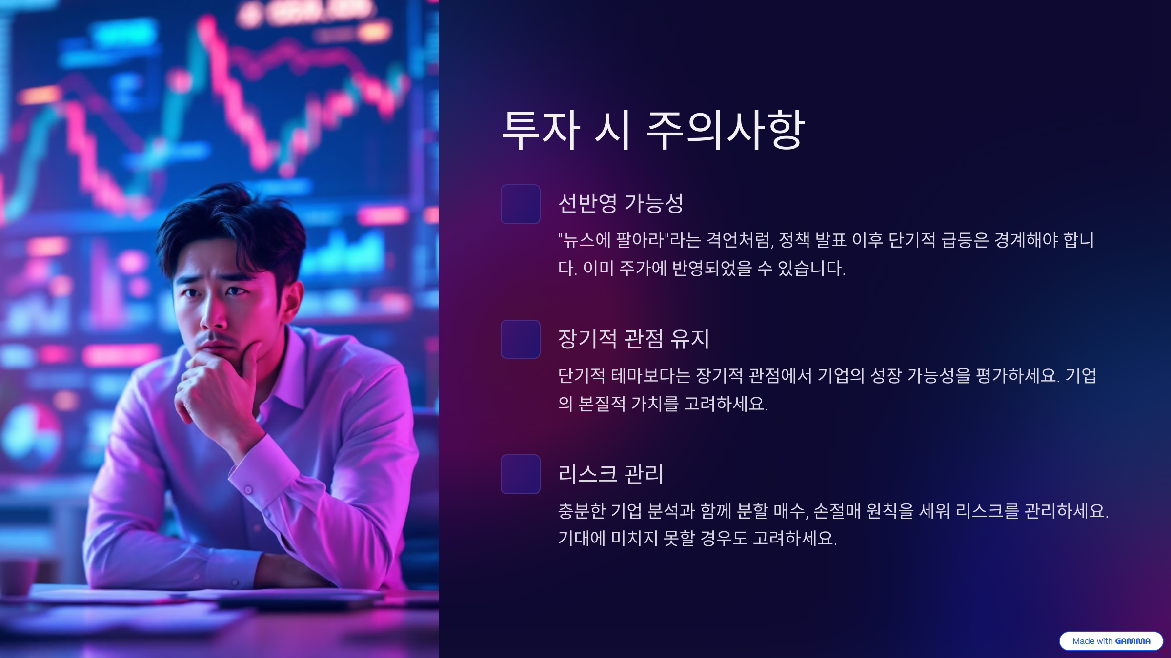 - 현명한 투자 전략: 정책 내용 파악, 기업의 재무 상태 및 사업 모델 분석, 적절한 진입 시점 고려, 그리고 분산 투자를 통해 리스크를 관리하는 것이 중요합니다.