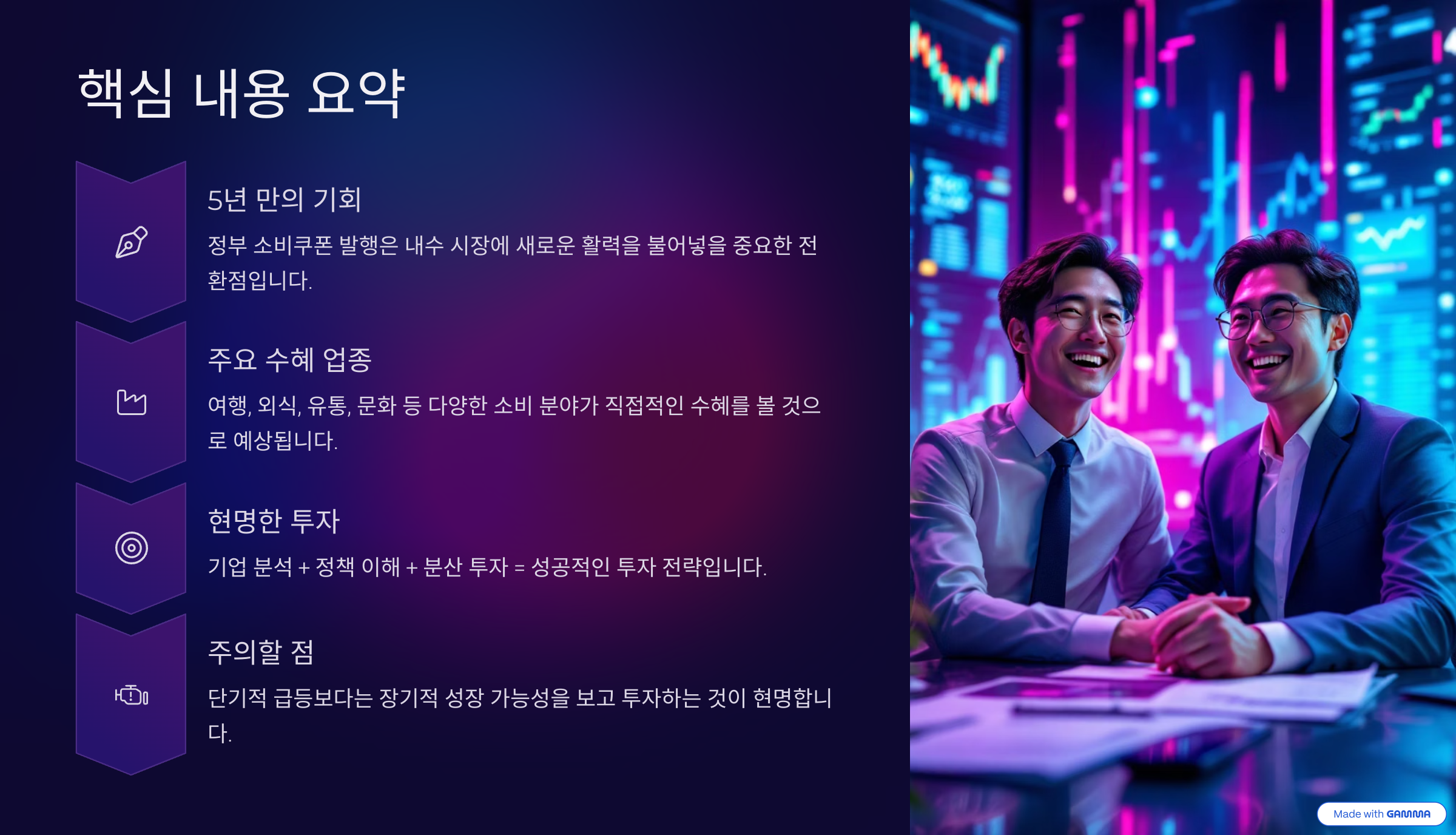 오늘은 5년 만에 찾아온 소비쿠폰이라는 특별한 기회가 왜 중요한지, 그리고 어떤 기업들을 눈여겨봐야 하는지에 대해 알아보았습니다. 저도 이번 기회를 통해 현명한 투자를 하려고 노력 중입니다.