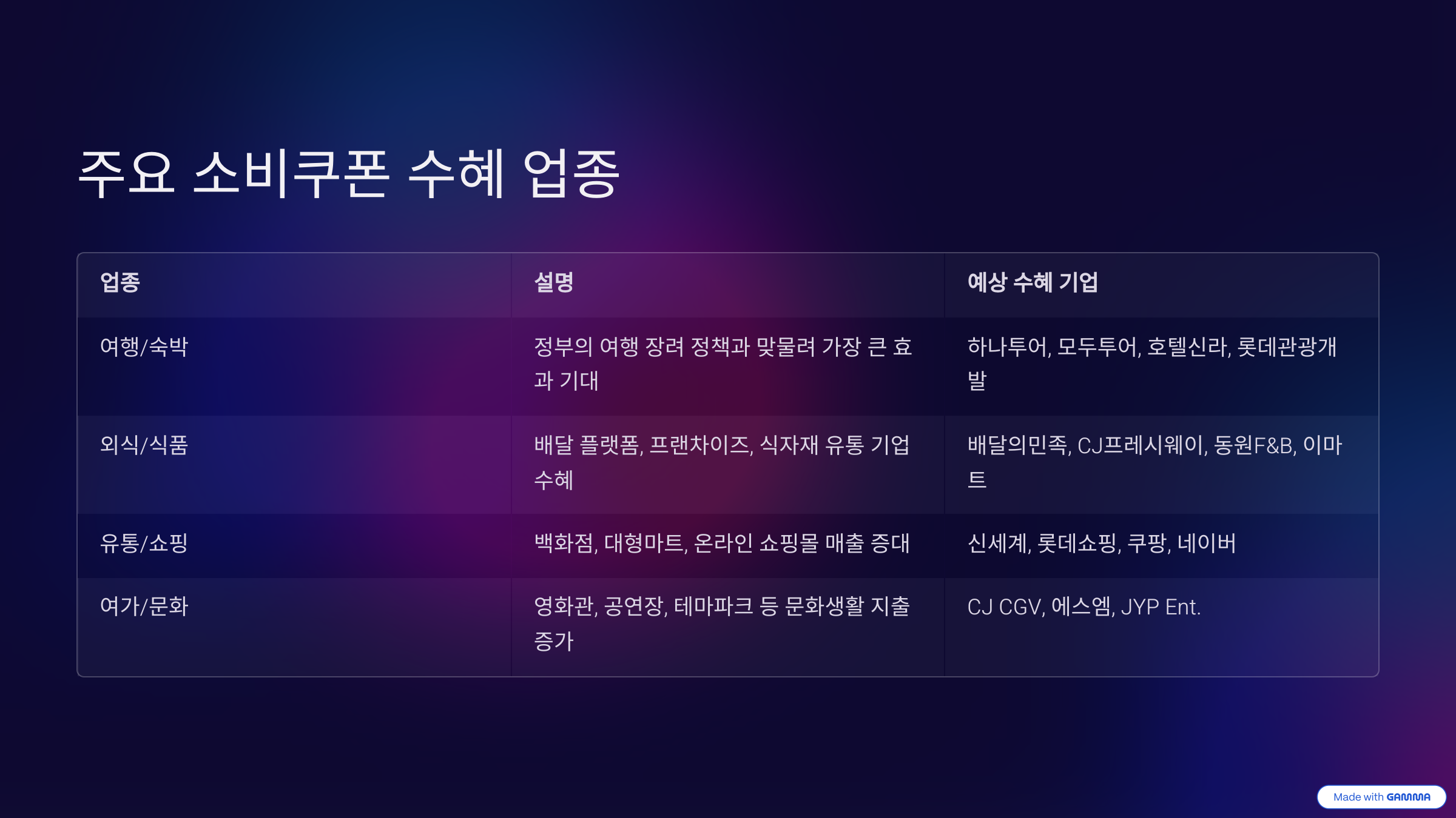 | 여행/숙박 | 정부의 여행 장려 정책과 맞물려 소비쿠폰이 가장 큰 효과를 낼 것으로 기대됩니다. 국내 여행 수요가 급증할 수 있습니다. | 하나투어, 모두투어, 호텔신라, 롯데관광개발 등 |