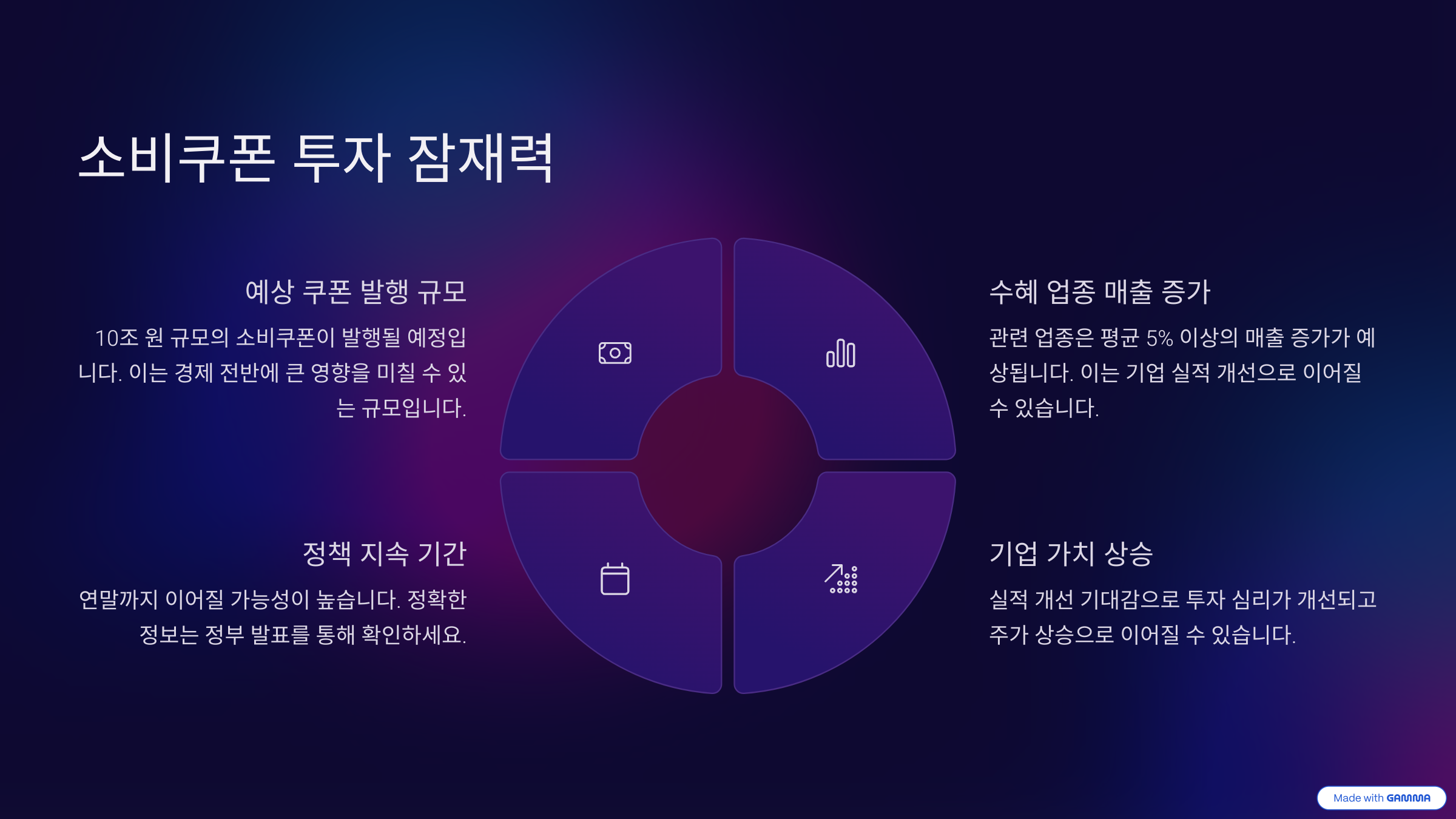 - 주요 수혜 업종: 여행/숙박, 외식/식품, 유통/쇼핑, 여가/문화 등 소비쿠폰이 직접적으로 적용되는 분야의 기업들을 주목해야 합니다.